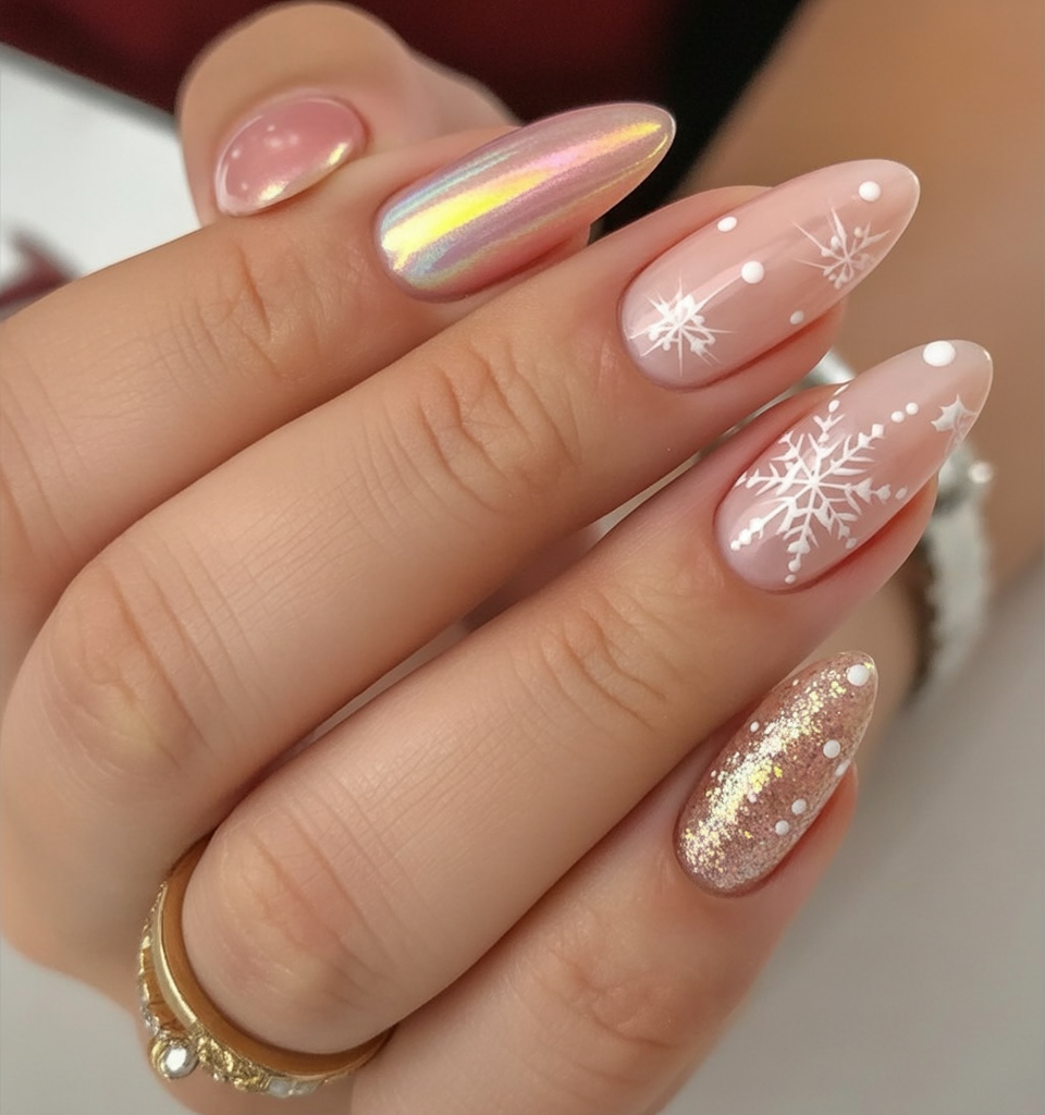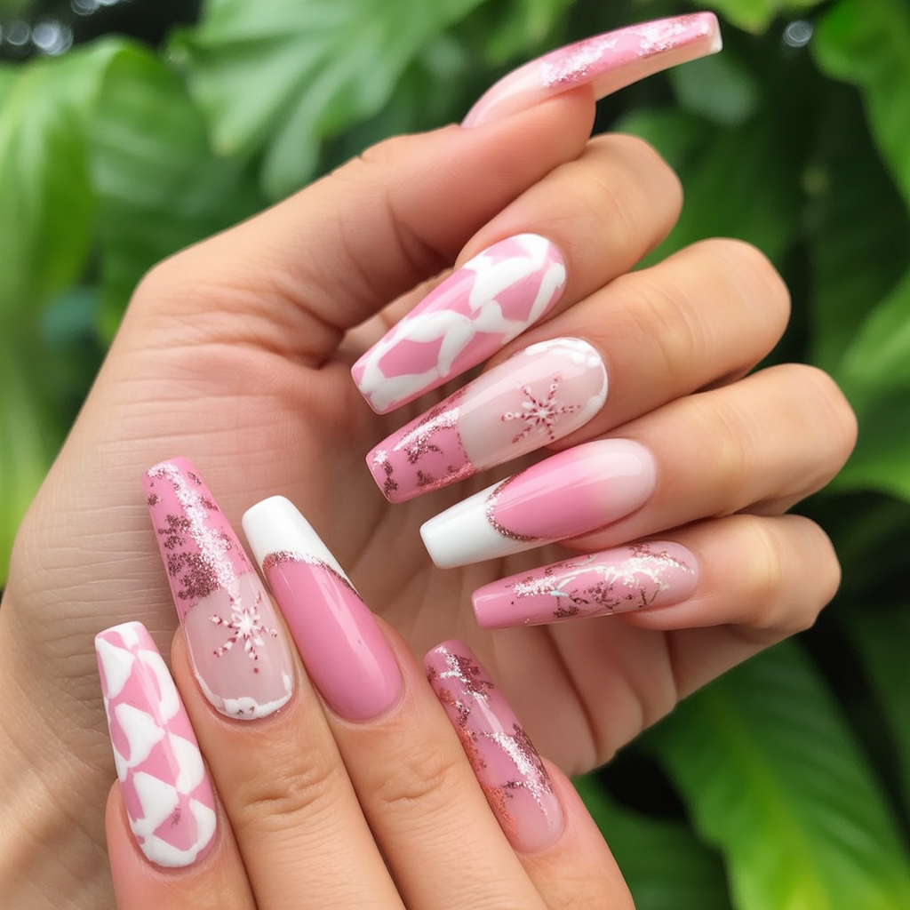 These pink nails combine frosty glitter, delicate snowflakes, and soft gradients to create a dreamy winter fantasy. The mix of playful patterns with French-inspired tips makes them feel sophisticated but also Cute and lighthearted. It’s a softer spin on holiday glam for those who love pink tones.