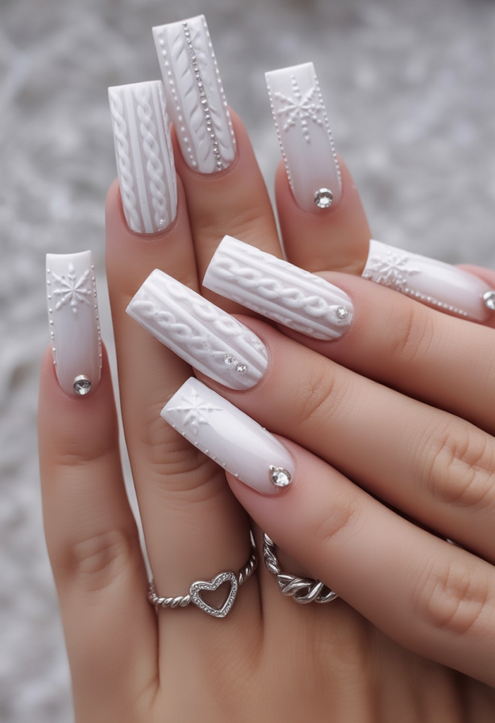 These nails bring cozy winter vibes with textured sweater-like details and delicate snowflake accents. The crisp white finish feels fresh and clean, while rhinestone gems add just enough sparkle to make them holiday-ready. They’re stylish but still give off a warm, comforting mood.