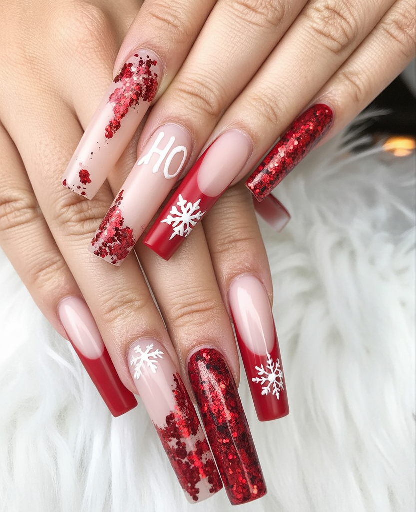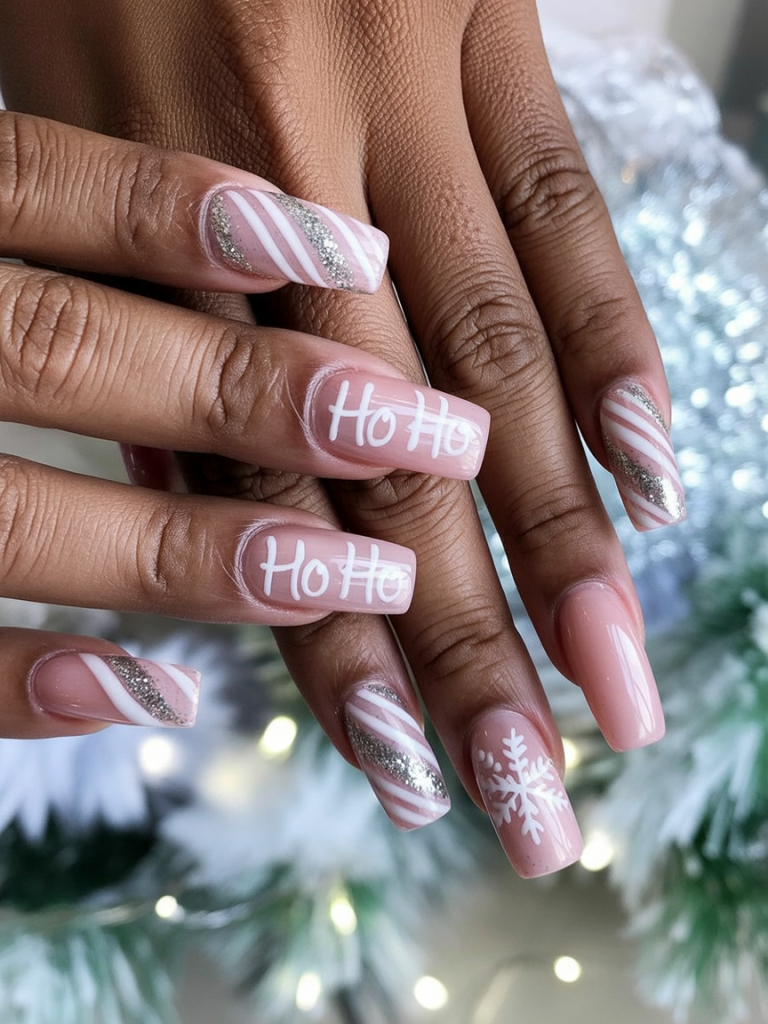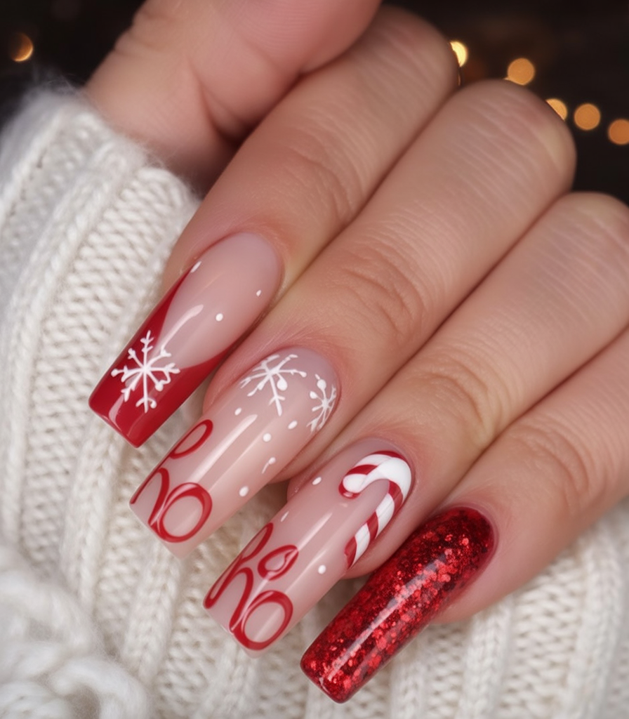 Cheerful and bold, this design mixes candy cane stripes, snowflakes, glitter, and playful “Ho Ho” lettering. It feels full of Christmas spirit while still keeping that polished, glam vibe. The mix of patterns makes the nails stand out without being too busy.