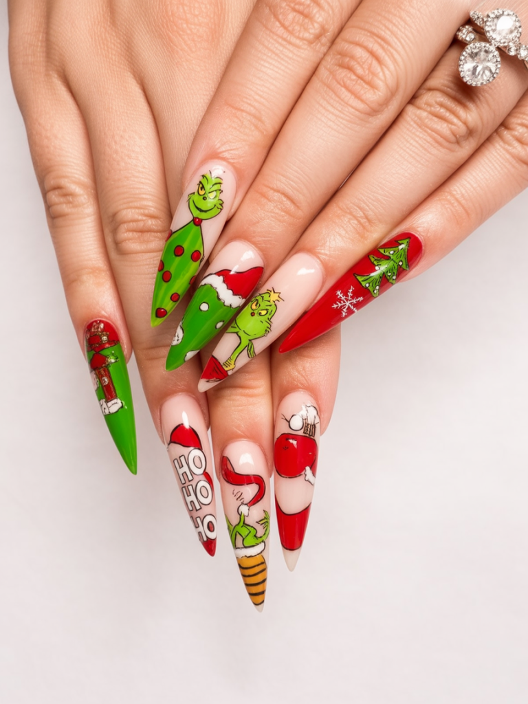 These nails bring all the sass and humor of the season with hand-painted Grinch art, bold red and green details, and cheeky Christmas graphics. They’re fun, dramatic, and definitely for someone who loves nails that spark conversation. It’s holiday inspo with a mischievous twist.