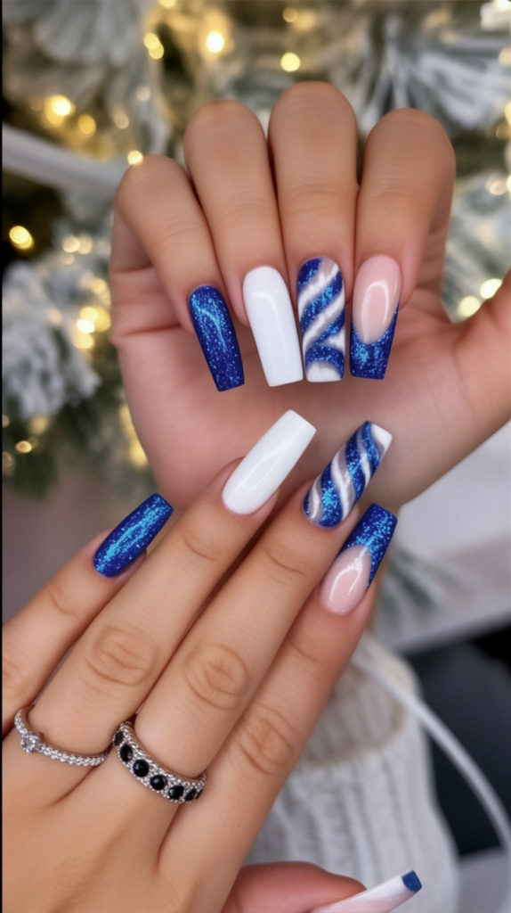 This design is ideal for long square acrylic nails if you love experimenting with different color palettes. Blue and white designs feel fresh for 2025 and give major inspo for anyone who wants baddie christmas nails that break the mold.