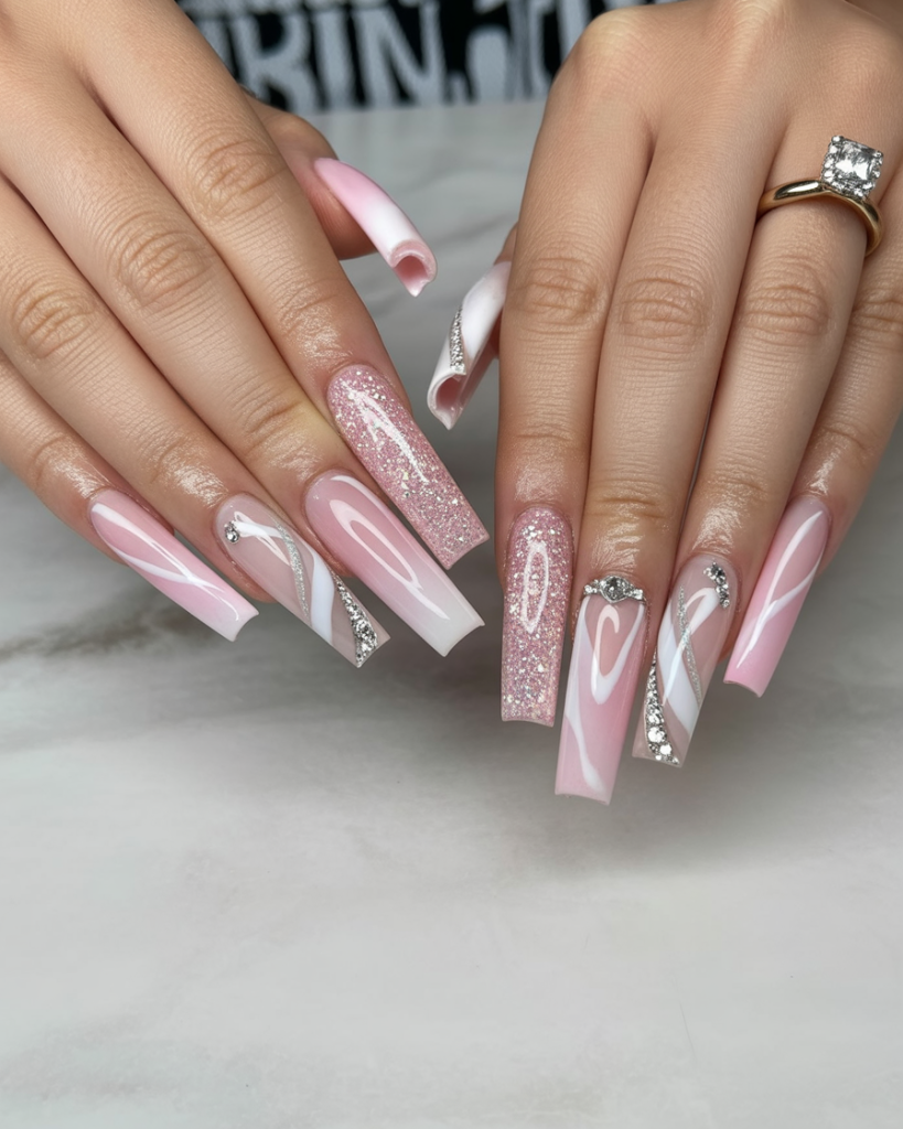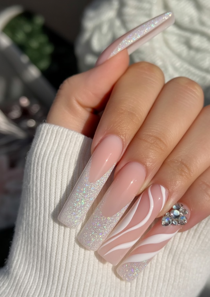 These nails shimmer like fresh snow under winter sunlight, blending soft nude tones with white glitter and elegant swirl accents. A touch of rhinestone detailing gives them a luxurious, polished finish that feels festive but chic. It’s the perfect set if you want understated glam.
