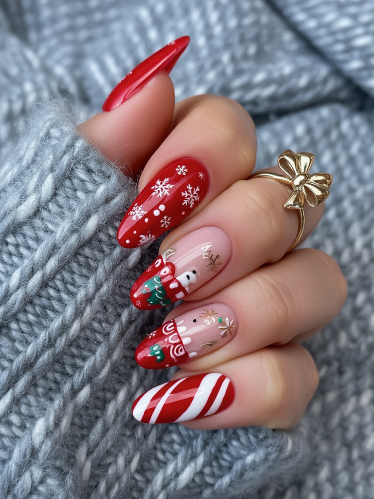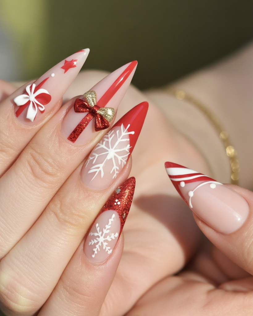 Festive and eye-catching, this set combines bold red, glitter accents, snowflakes, and bow designs that feel like beautifully wrapped presents. The stiletto shape adds drama, while the combination of red and gold makes them unforgettable. These nails scream holiday confidence with every detail.