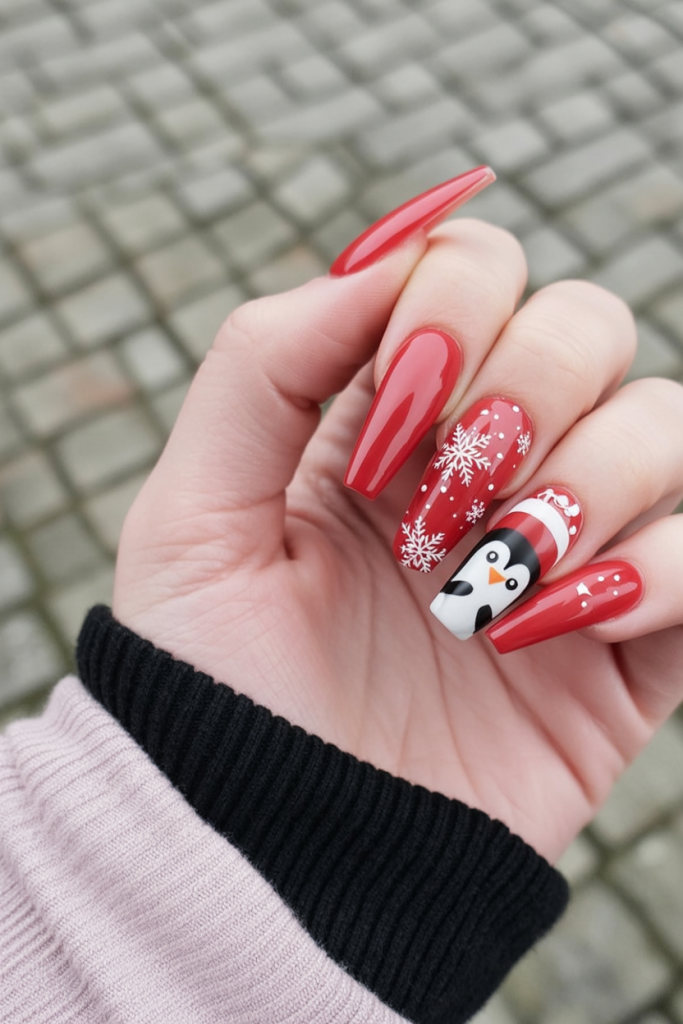 Charming and cheerful, these red nails have a cute penguin accent, and snowflakes surround it. The shine of glossy red looks bold and classic, while character art gives loud tones to the description: fun to do and stylish.