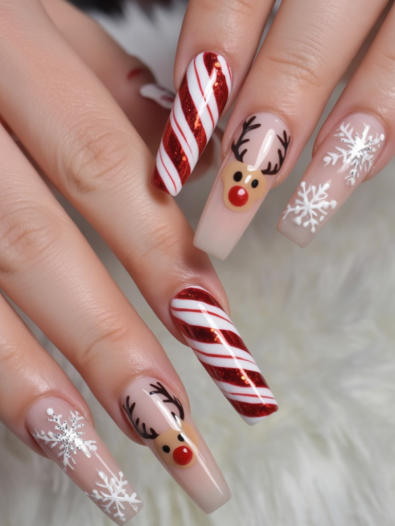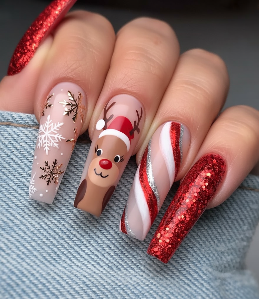 Fun and festive, this manicure mixes glitter, candy cane stripes, and an adorable reindeer accent nail. It feels cheerful yet bold, like a playful nod to classic holiday cartoons with a modern twist. The combination of red shimmer, snowflakes, and a Cute character design gives these nails so much personality.