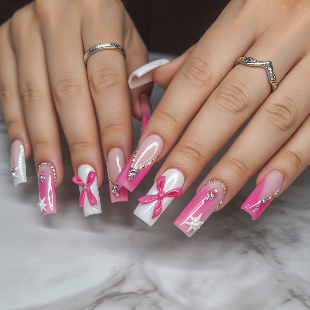 Perfect for long square acrylics, this set is great if you love Cute and detailed designs with a baddie twist. The bows and gems make it stand out, while the pink base keeps it playful and unique compared to classic red and green ideas.