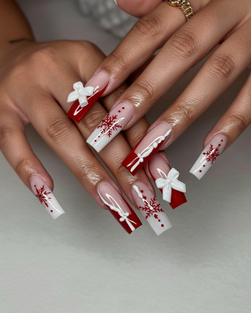 This manicure feels like unwrapping holiday gifts with its bold red tips, delicate snowflakes, and striking 3D bows. The design is playful yet stylish, mixing crisp white with a classic Christmas red for a polished festive look. It’s the perfect mix of Cute and glam.