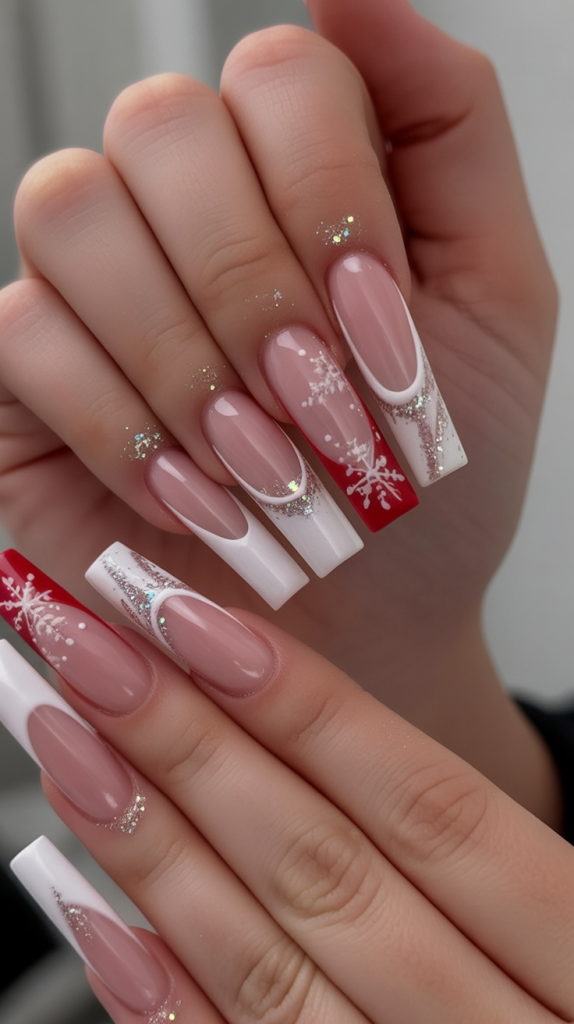 Clean and refined, this look pairs French-inspired tips with a touch of silver glitter and snowflakes. The subtle red accents add a festive flair, making it chic but still perfectly holiday-ready. It feels elegant, like a classic Christmas party manicure with a modern twist.