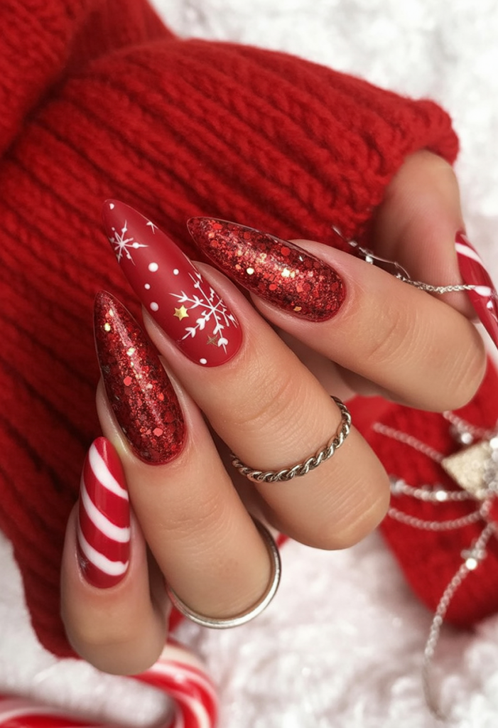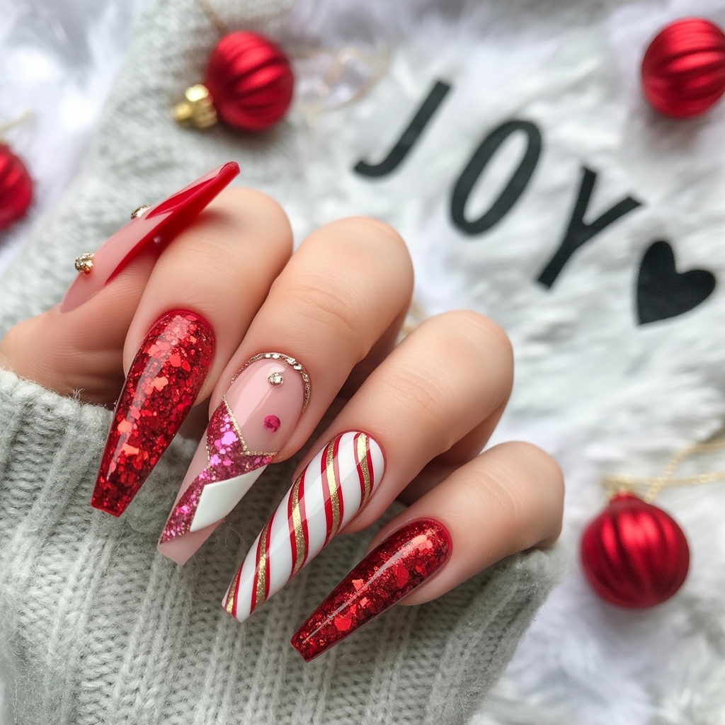 Bold red glitter steals the spotlight in this design, paired with candy cane striping and shimmering accents. The mix of sparkle and pattern gives these nails a vibrant, confident vibe, perfect for anyone who loves to stand out during the holidays.