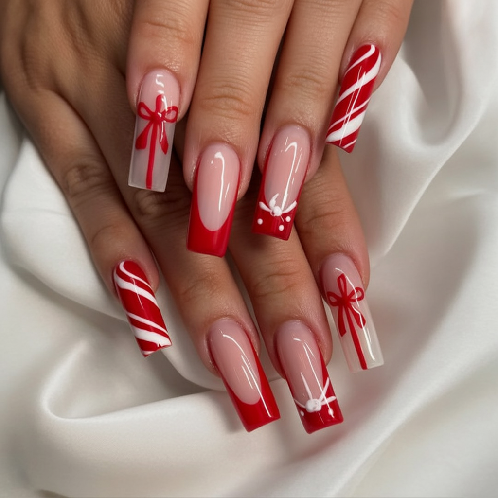 Perfect for long acrylic nails in coffin or square shapes, this set is a go-to if you love red and white designs with a playful edge. The glitter keeps them sparkling in any light, and the fun mix of patterns makes them holiday-ready with zero extra effort.