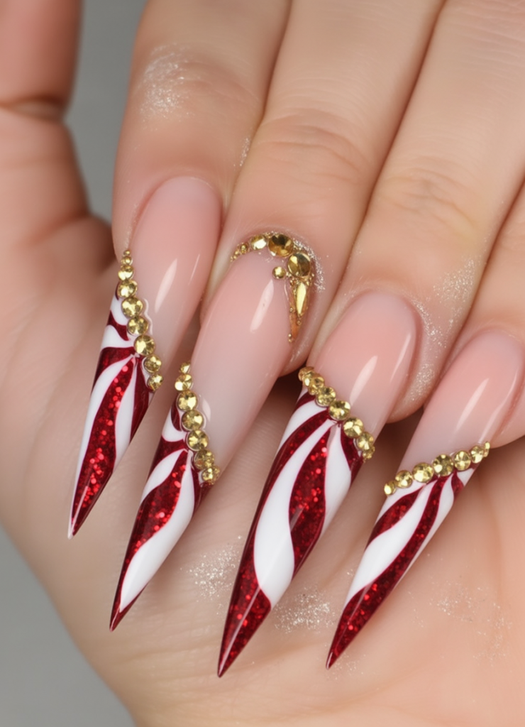 Dramatic and dazzling, these stiletto nails mix red glitter candy stripes with golden rhinestone trim. The sharp shape adds attitude, while the sparkle and shine give them undeniable holiday glamour. They’re the definition of bold baddie christmas nails.