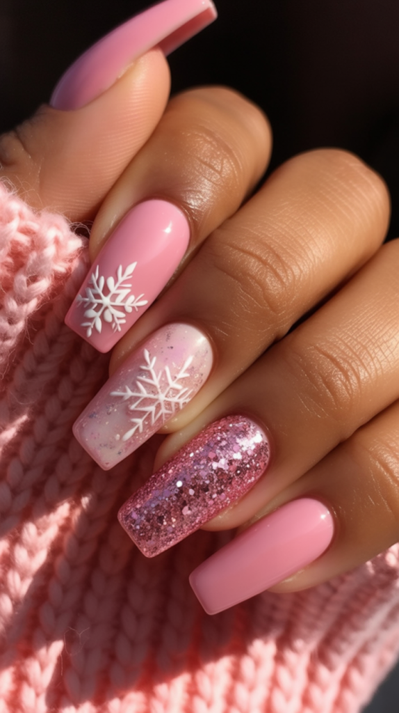 If you’ve got long pink nails in a square or coffin shape, this style is made for you. The white snowflakes pop beautifully against the pink base, making it a standout design for holiday parties. It’s especially flattering on longer medium length nails because it elongates the fingers and adds that polished seasonal flair.