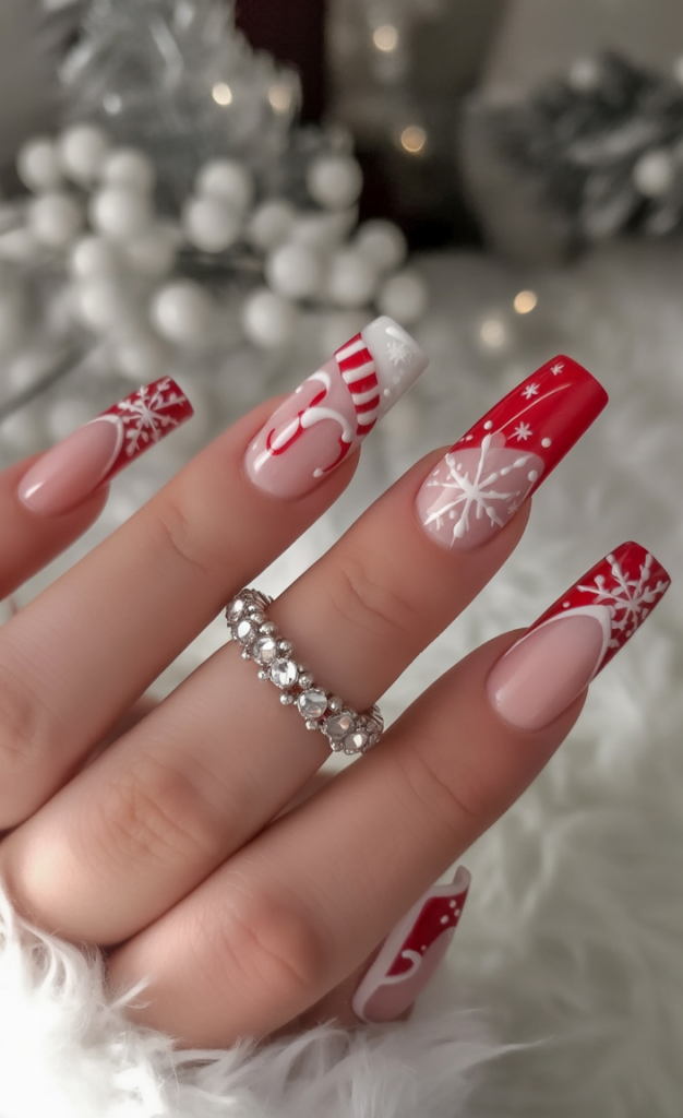 This look takes boldness to another level with bright red, sharp white detailing, and festive candy cane stripes. The snowflakes tie the whole holiday aesthetic together, giving off a vibe that’s both sweet and powerful. It’s a confident set of nails that turns every hand gesture into a statement.
