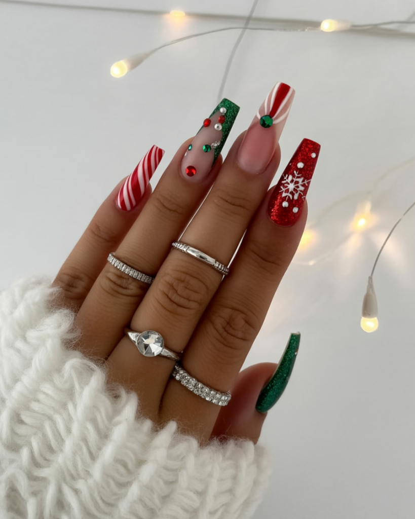 If you’re after full-on festive glam, these nails deliver. Red glitter, green sparkle, and candy cane striping are paired with gem-like accents for a look that’s extra but in the best way. It feels daring, playful, and perfect for a holiday night out where your nails are meant to shine.
