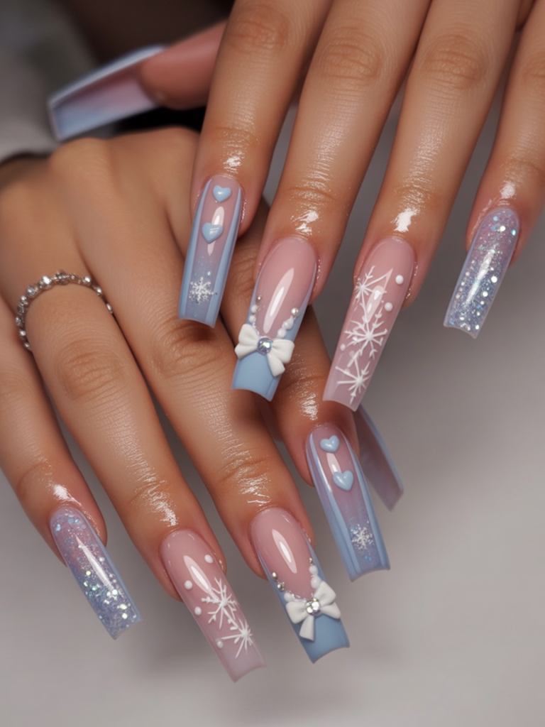 Soft icy blue meets delicate white in this playful yet chic manicure. The added heart accents and 3D bows give it a whimsical, gift-wrapped vibe that’s festive without being over the top. Glitter and snowflake details complete the frosty, magical look.