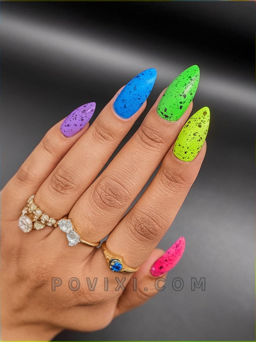 Hot summer appeal shines through almond-shaped nails with five edgy black speckled matte neon applications: purple, blue, green, yellow and pink. This nail design combines energetic personality traits with artistic talent through neon color combinations to meet your expressive needs. The nail shape is ideal for mid-length fingers as it looks attractive with gold rings and everyday accessories. People who choose gel or acrylic nails will love the polished and exciting look of this set.