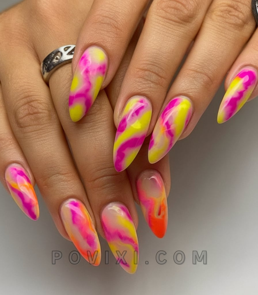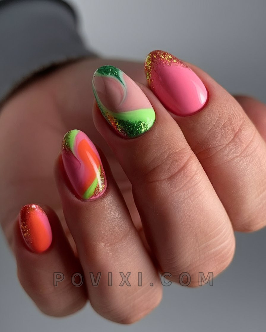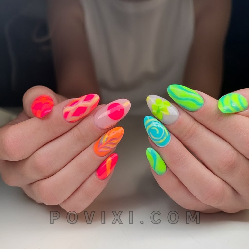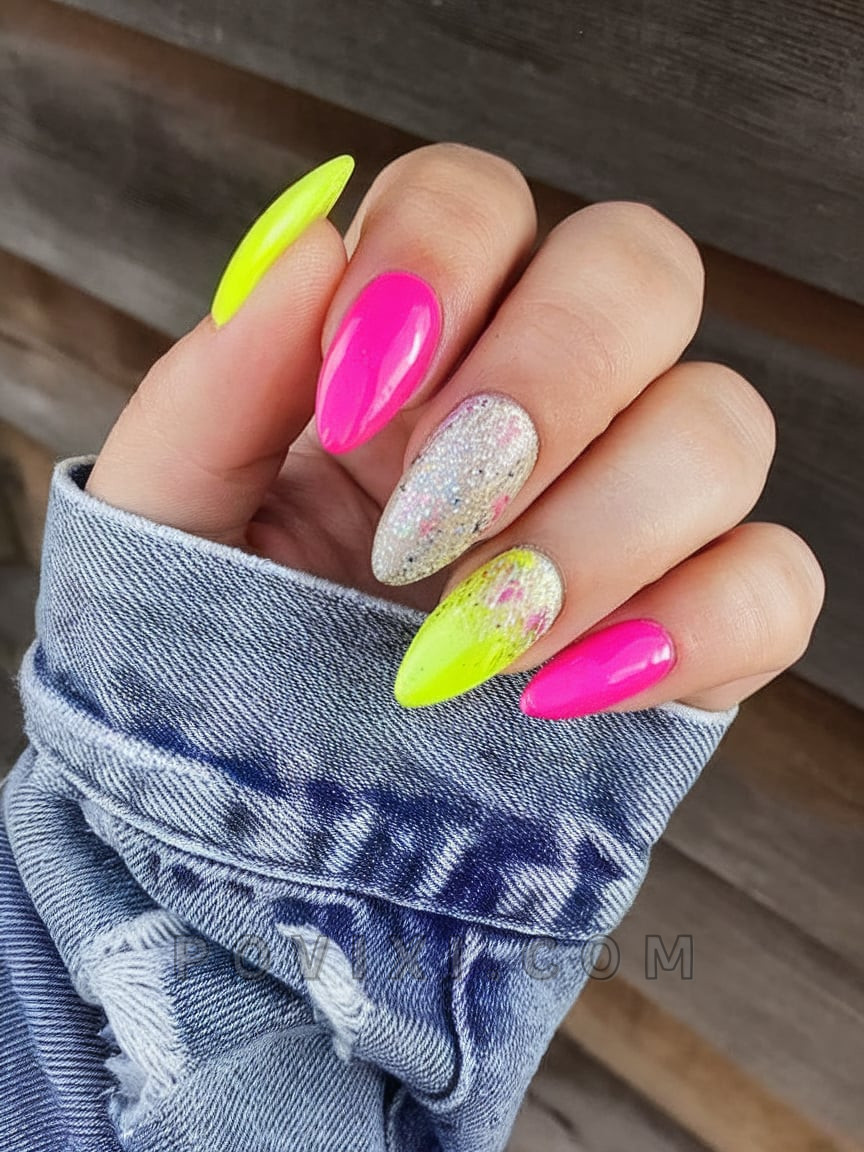 Hot pink and neon yellow team up with full-on glitter glam in this bold, party-ready look. This almond-shaped nail design shows unapologetic sparkle by applying dense glitter to two nails along with delicate splashes of color. These fun neon color combinations work best for birthday parties, bachelorette parties and summer evening rooftop gatherings. Gel nails become your main accessory, requiring only your confidence to shine.