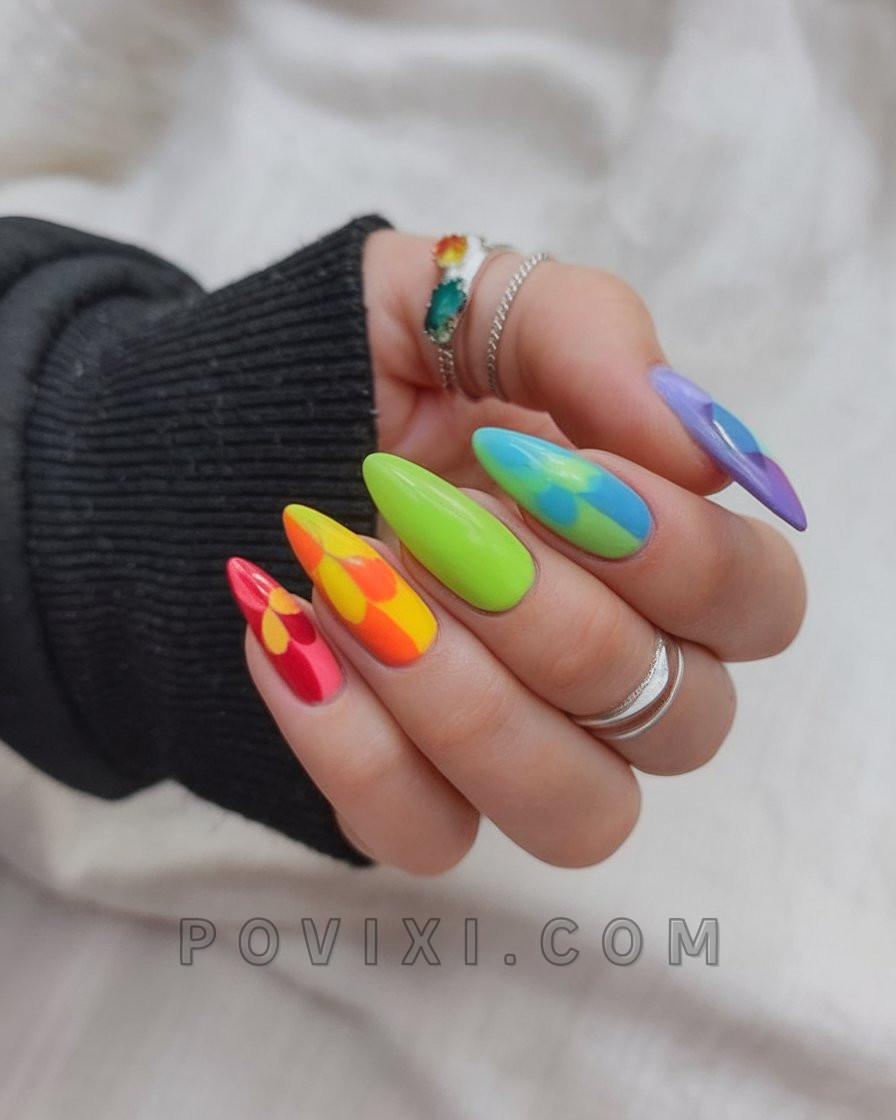 The almond-shaped nails act as a rainbow mobile that people can actually wear. This 70’s flower child inspired nail art draws from 2025 innovation by combining different bright hues along each nail with red on one side and purple on the other, separated by colorful orange bases and daisy petal drops on selected nails. The glossy finish gives the design an updated, modern look and the playful design works perfectly in a variety of summer settings such as road trips or festivals. The manicure features bright neon colors while maintaining nostalgic qualities.