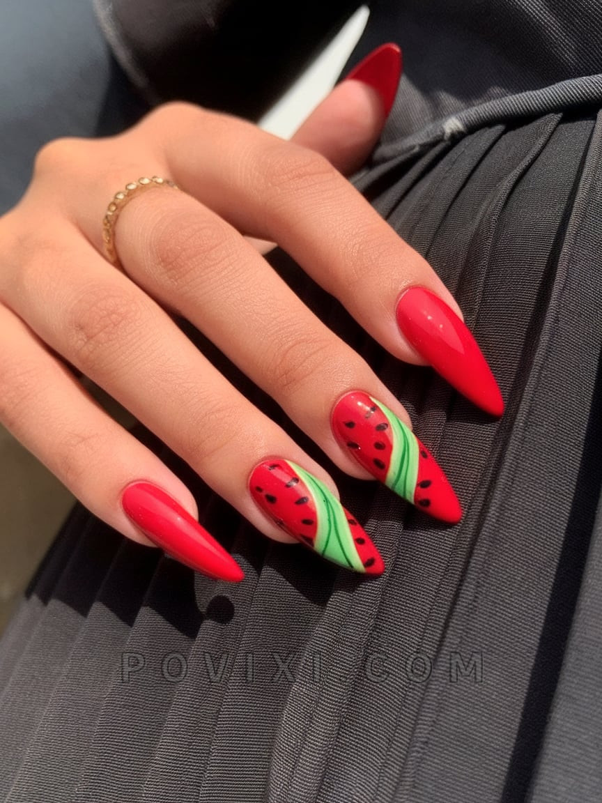 Two almond-shaped nails feature watermelon elements as adorable watermelon slices, while the rest of the nails have a red base and green rind with black seeds as details. This lightning fast nail design is full of summer fun. This nail art design presents a cheerful interpretation, which makes it ideal for July outdoor events such as BBQs and picnics with fruit motifs. Gel nails look best when paired with gingham prints and fresh white outfits to achieve the fruity dream effect.