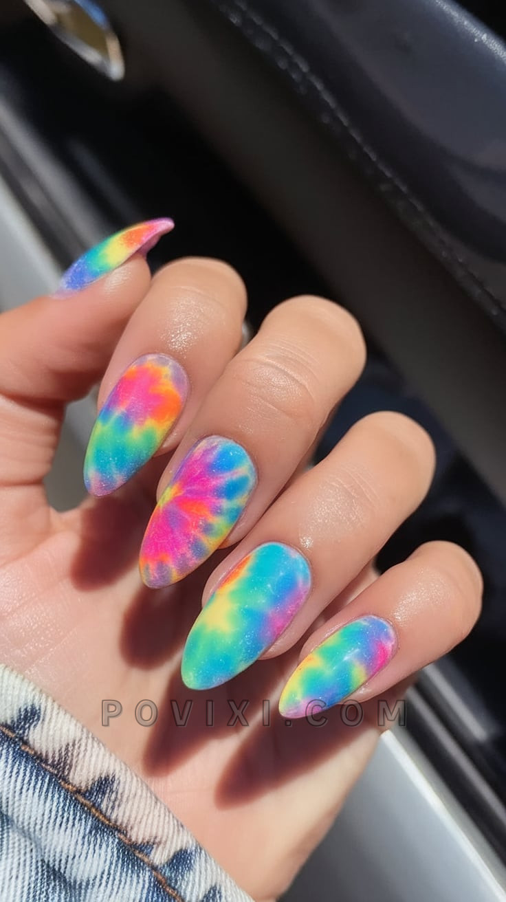 A round nail design appears to emerge from a pastel cloud shape. A deep tie-dye pattern in neon blue, pink, orange, green and yellow delivers an unguarded summer spirit. A matte texture finish respects the bold design statement of 2025. People who want bold versions of their natural nails or alternatives to standard gel or dip nails should consider this design.