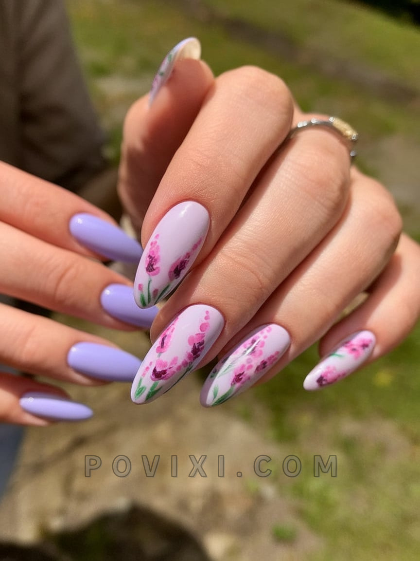 This elegant floral design features delicate rosebud paintings on plush lavender nails. The oval nail shape creates feminine lines, yet the brushed floral motifs have a hand-painted look similar to authentic porcelain. The set is perfect for weddings and tea parties without compromising a minimalist’s penchant for delicate art. This design is for women who want elegant and natural nails that retain their allure.