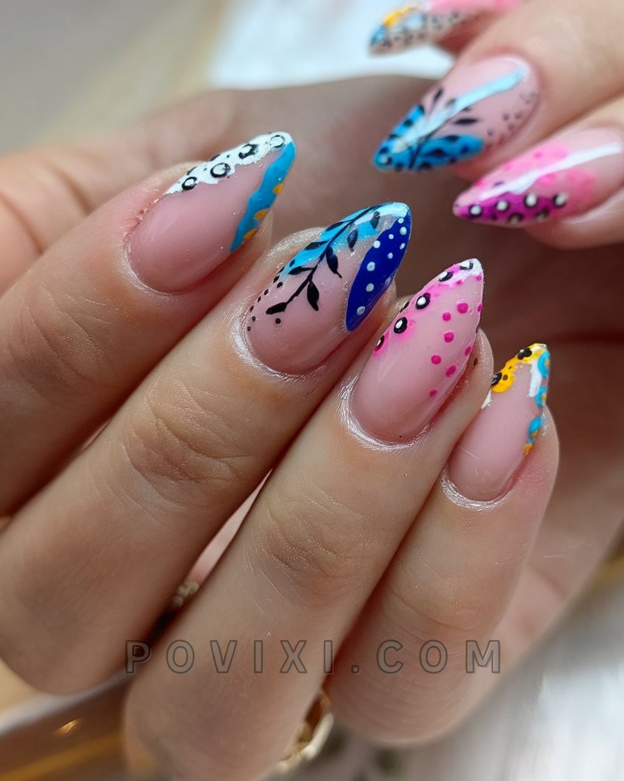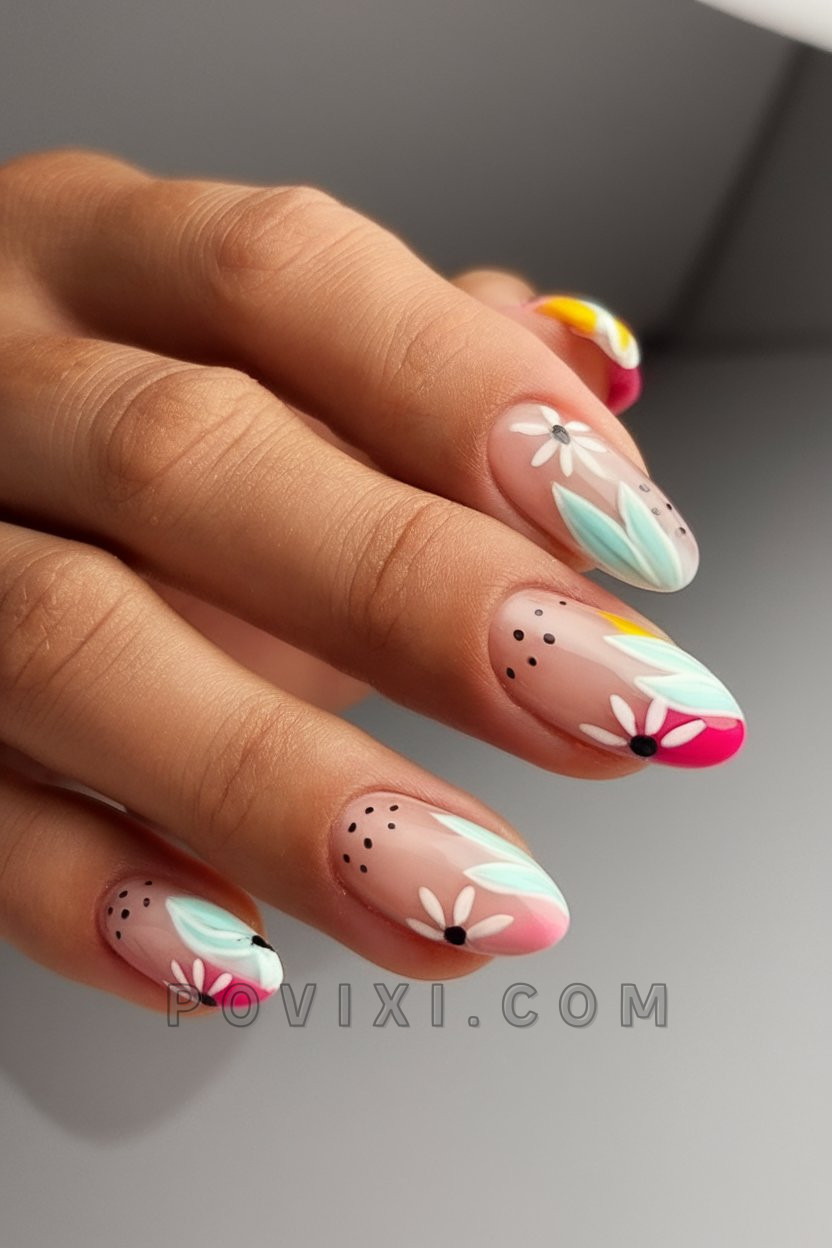 Channel your inner flower child with this blooming nail art design in soft colors – mint green leaves, blush pink petals and tiny black polka dots. The short, almond-shaped natural nails offer versatility by being practical for everyday use while still attracting attention. The nail combination creates a fashionable pastel look perfect for linen dresses and airy skirts under the summer sun.