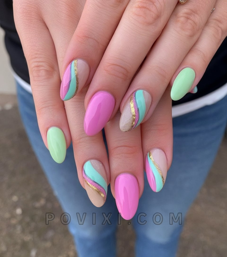 The color combination and subtle gold shimmer outline serve as a minimalist way to achieve a striking nail look. Soft mint tones blend with lilac and teal, followed by baby pink to outline nude areas that are layered with a soft gold shimmer before the waves pattern over a gel nail base. The 2025 mermaid core aesthetic provides energy through a sophisticated, sophisticated take on traditional mermaid themes. This color scheme offers a sophisticated yet playful way to wear color that works best for late-night dates or outdoor brunches.
