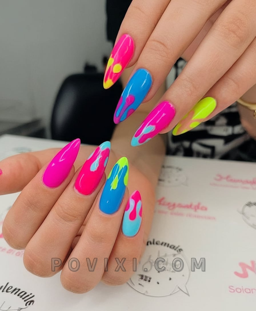 This nail design uses neon independently in a fresh way through a revealing glossy finish with droplets that blend pink with blue and yellow. These playful artwork designs incorporate streetwear elements that are perfect when paired with graphic t-shirt outfits or festival-themed clothing. These elongated, almond-shaped nails add drama to the design, and the unpredictable color palettes stand out as a signature nail trend for 2025.