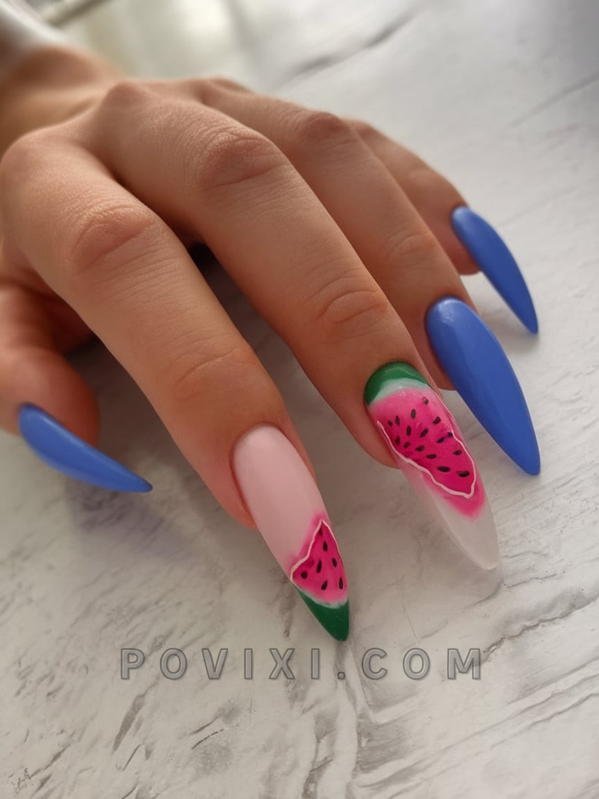 Watermelon gets a fashionable twist in this design. The combination of royal blue matte nails contrasts with the artfully designed watermelon pattern that sits atop soft blush and white. The almond cut of the nails provides a fashionable style, but the festive motif creates a youthful finish. These gel nails have a playful design that will work with both vibrant outfits and simple separates. Definitely one of the standout designs of the season.