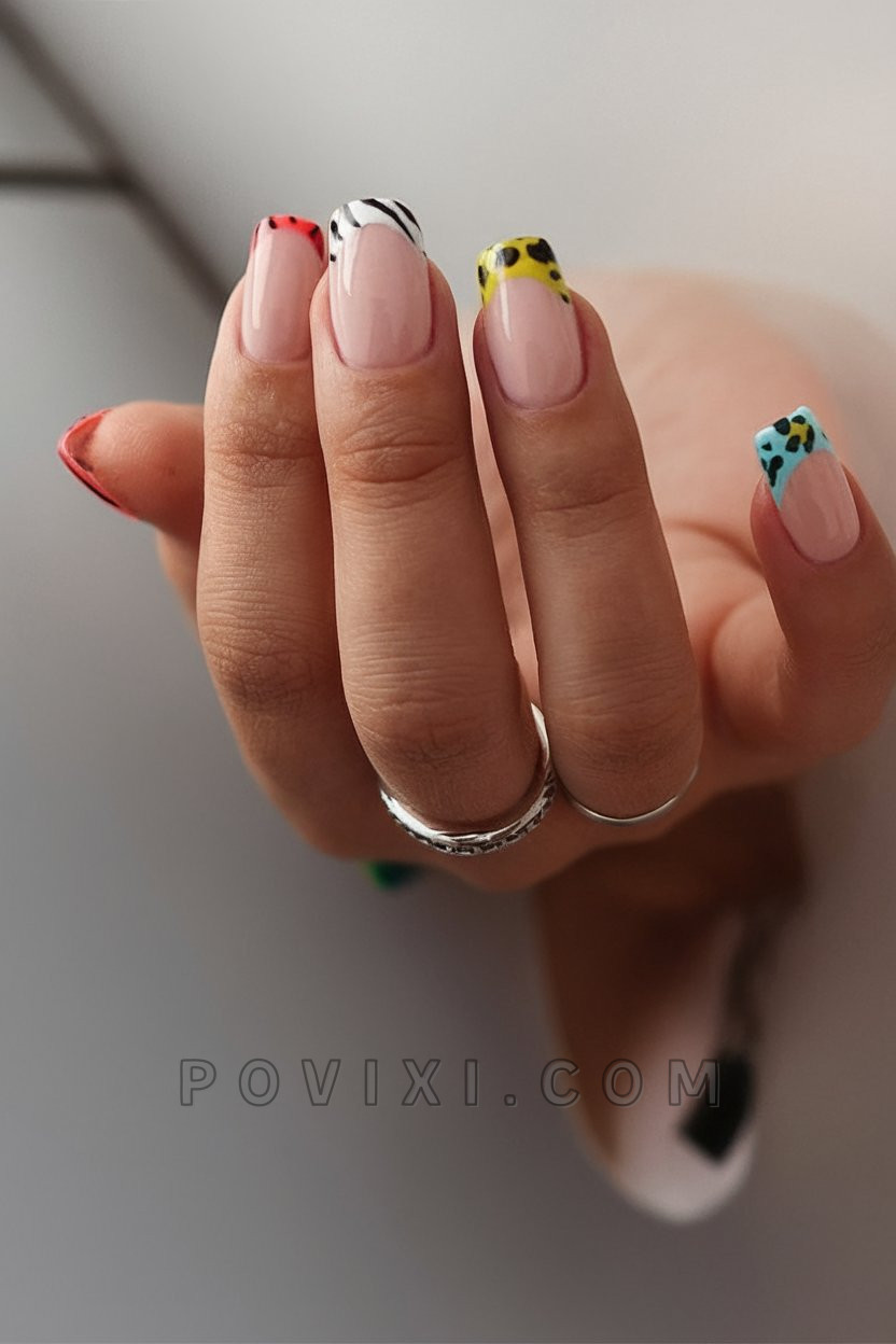 Creating four different wild patterns defeats the need to choose just one. The square nail design transforms the look by combining elements of color and texture to achieve modern rebel fashion. The nails receive four individual pastel and vibrant patterns that alternate from fingertip to fingertip, including red cheetah print alongside zebra stripes, lemon yellow leopard and sky blue cheetah. Painted on a shiny nude base, these vibrant nail tips represent total freedom from conventional rules. The acrylic design is for the fashion-forward person who needs something exciting yet practical.