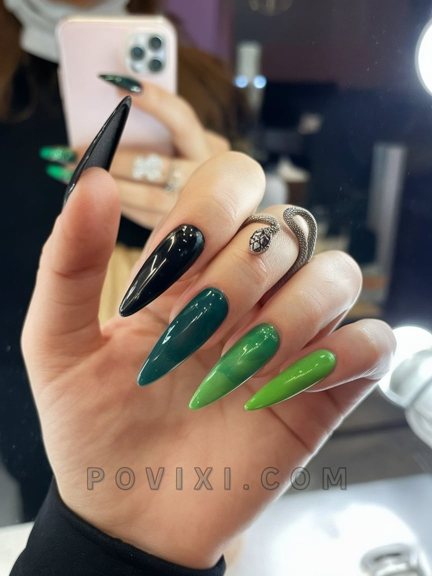 This stiletto-shaped gradient features electric lime green that transitions to rich emerald on its way to inky black for a sophisticated and bold gel look. Nighttime outings and strong self-portrait opportunities make this gradient perfect as it represents a contemporary ombre design with a glossy finish. The deep green shades within this manicure create an elegant unknown quality that the black tip points to grounding and universal style attributes. The acrylic option provides outstanding performance and suits people who enjoy eye-catching differences combined with cheerful patterns.