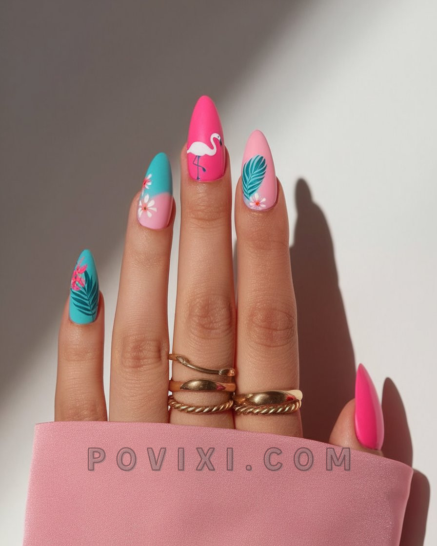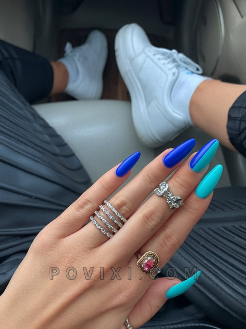 Alternating fingers showcase vibrant cobalt blue followed by juice aqua nails that create a summer season feel. The contrast between these two colors creates a playful look that is perfect for almond or oval nail shapes. These tropical-themed nail designs are the perfect combination for casual denim and sneakers or beach days. This polished design effectively captures the delightful look that will dominate the fashion world in 2025.