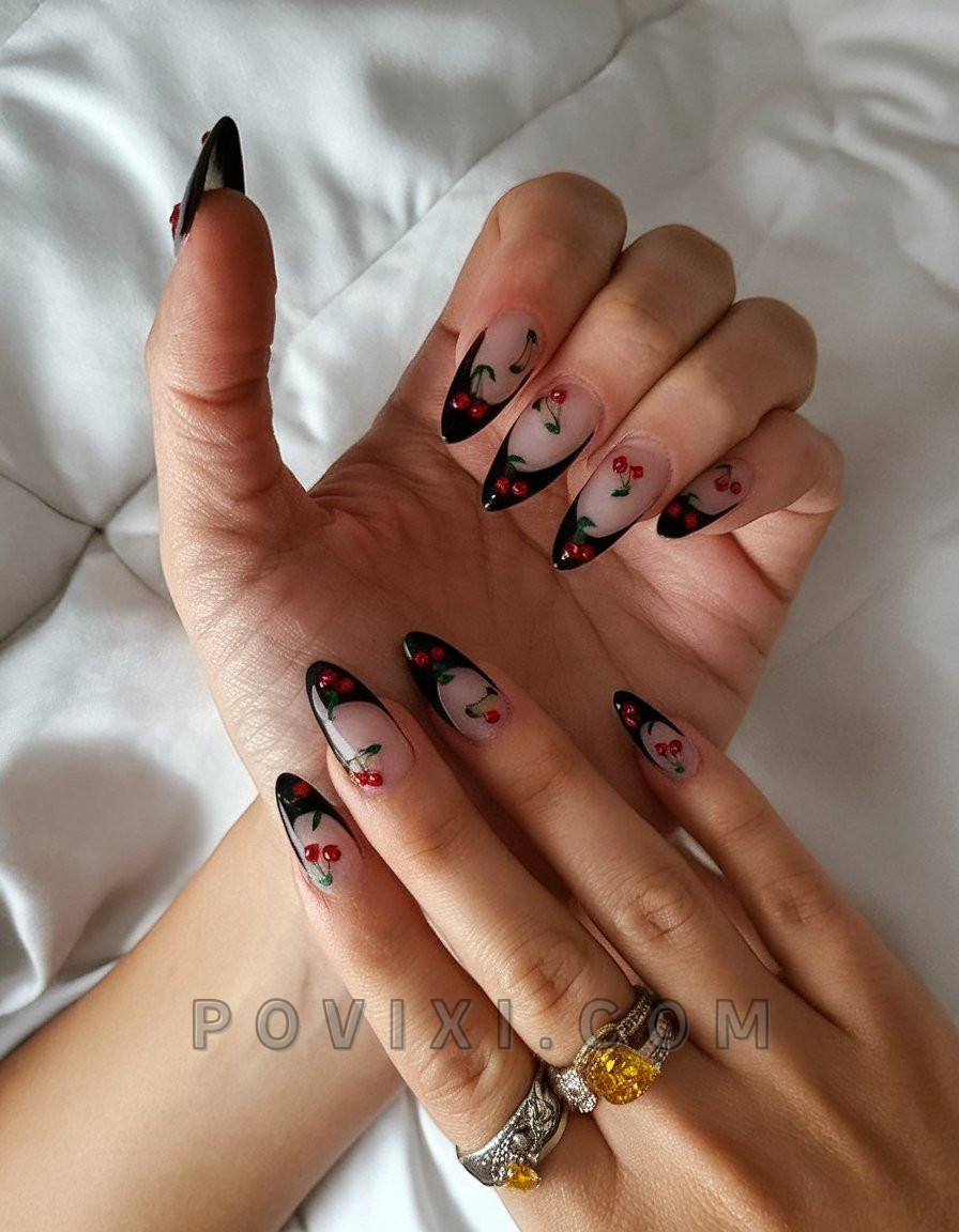 A modern cherry motif appeals to all seasons as the black almond tips match the delicious red cherries on the green vine. The base color keeps the artwork prominent as the almond nail shape elongates the fingers in a sophisticated way. A gel or dip almond nail design provides the best summer aesthetic for people who want to combine sophistication with fun in their nail style. Combining gold accessories with a red lipstick creates a sophisticated retro look.