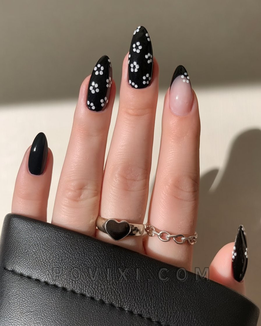 Black without vibrancy is just a misconception because these nails prove otherwise. The merging of glossy black with small white daisy patterns shows that dark colors can create an elegant summer style. The salon creates visual interest with a combination of nails that alternate between full color and sections of French-style designs. The almond-shaped nails appear softer and the selected colors maintain both trendiness and elegance. The design is suitable for city evenings as well as for simple outfits that show off their bold side.