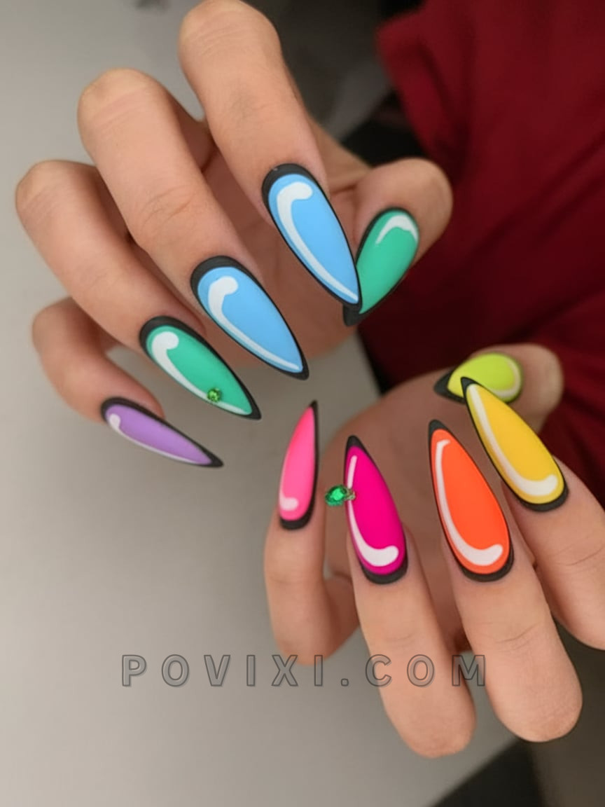 Designs 2025’s comic book inspired trend is perfectly captured in this almond-shaped nail design with sharp edges and bold black lines. The nails feature a unique assortment of distinct bright colors including pastel green, vibrant blue, electric pink and their base is given whimsical white details for a cartoon-like 3D appearance. The small gemstone adds a sophisticated element with its elegant appearance. This style creates an enchanting and playful fusion that makes a great opening theme for rooftop nights or art exhibitions.
