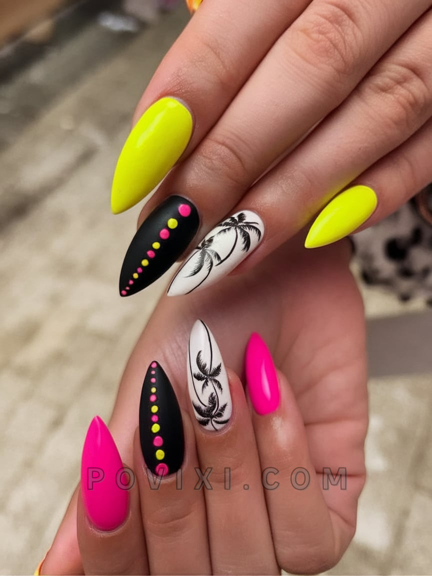 Acrylic nails exist as a loud declaration of a beach vacation. Painted in high-contrast neon colors, this matte black and white nail art design features palm trees and colorful dots across the surface. This design effectively blends dramatic nail art elements with a relaxing tropical theme while remaining graphically beautiful. The oval shape of the nail creates an elegant arch that enhances the movement and feminine qualities of the artwork. This design is suitable for women who either need nails for a vacation or want a tropical look for everyday use.