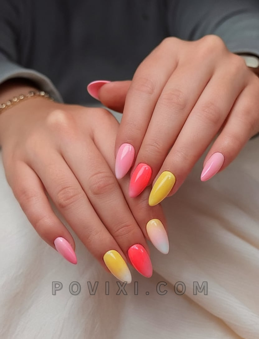 The combination of fuchsia with lemon yellow and orange in gel nails creates a playful effect that resembles a summer popsicle as it melts in the sunlight. The almond shape creates an elongated elegance that completes an amalgram of funky and classy style. People see this style while standing in line at the grocery store and receive compliments while visiting the coffee shop. The unique color choices in these nails suit individuals who are looking for both elegant and eye-catching designs as well as a skin-tone compliant style.