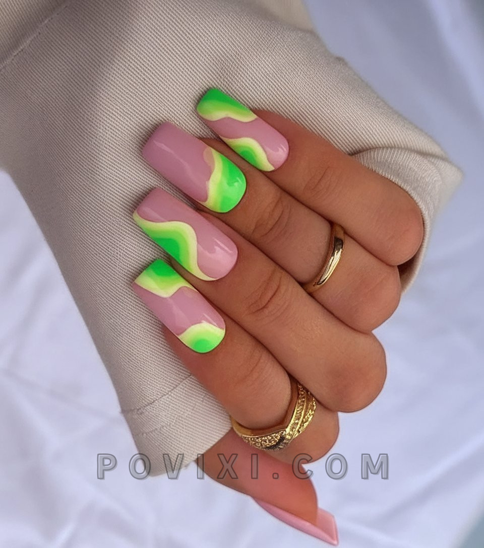 This design of pink and lime green waves creates a refreshing, zesty look. An application of dusty pink background color supports the retro-futuristic aesthetic created by the swirling patterns. The square nails provide strong artwork space to effectively showcase different color patterns. The square nail design looks fabulous when paired with denim or neutral colors to create an effortless summer outfit. This nail design is one of the top choices for square nails in 2025.