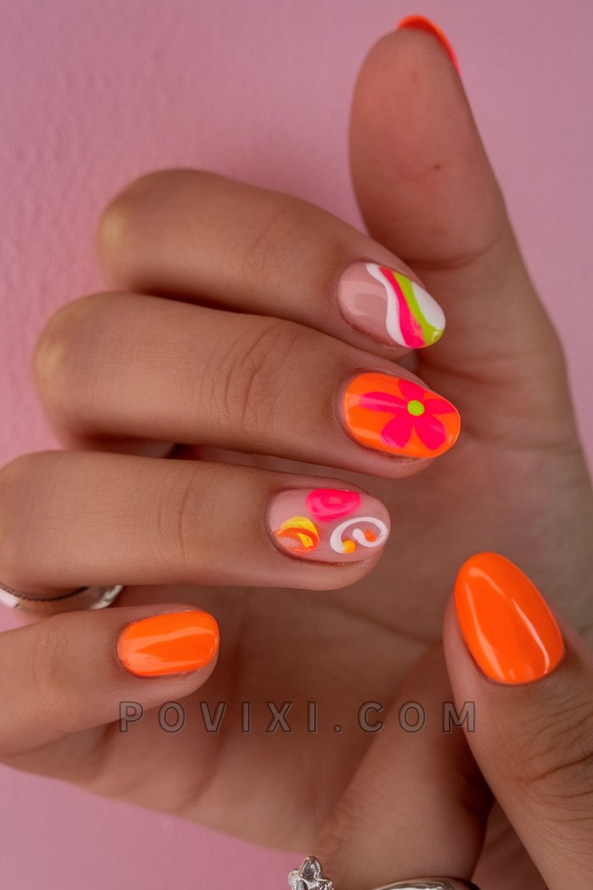 POSH stands for small nail designs, which despite their size have a significant creative flair. This set blends retro and contemporary elements by combining neon orange with abstract swirls and a charming floral embellishment. Natural nails define the nail type in this design and the handmade artistic touch makes it an expressive personal statement. These nails should complement white dresses as well as leather miniskirts.
