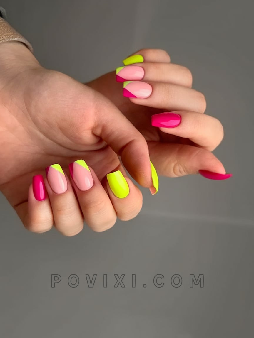 A contemporary French tip blends basics of neutral over layers of hot pink and neon yellow color-blocked gel nails. The square nail shape provides a crystal-clear appearance, resulting in a stylish, high-impact design suitable for everyday wear. These minimal yet fresh designs from designs 2025 are a perfect option for people who want simple yet eye-catching nail designs.