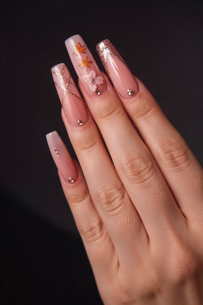 It makes me want to realize how perfect these fluffy blush-colored nails with neat little golden studs and glittery ornaments and even the edging of adorable maple leafs are. The small flower detail in the middle brings the little touch of feminism that reminds being in the autumn garden party in your favorite cozy sweater holding a latte in your hands.