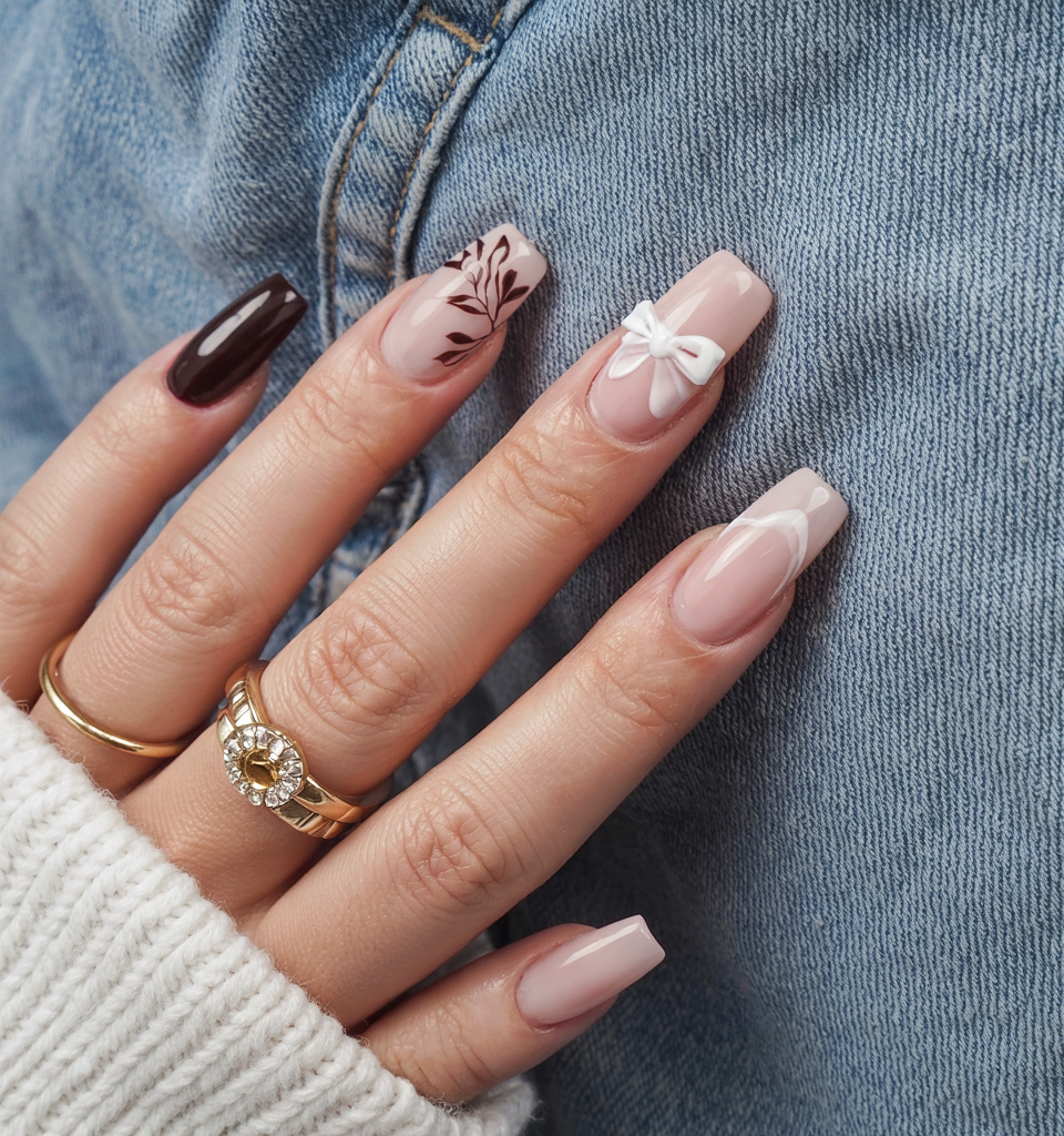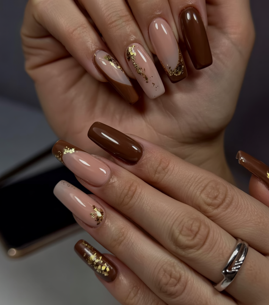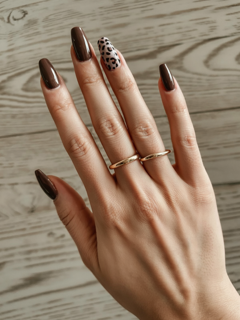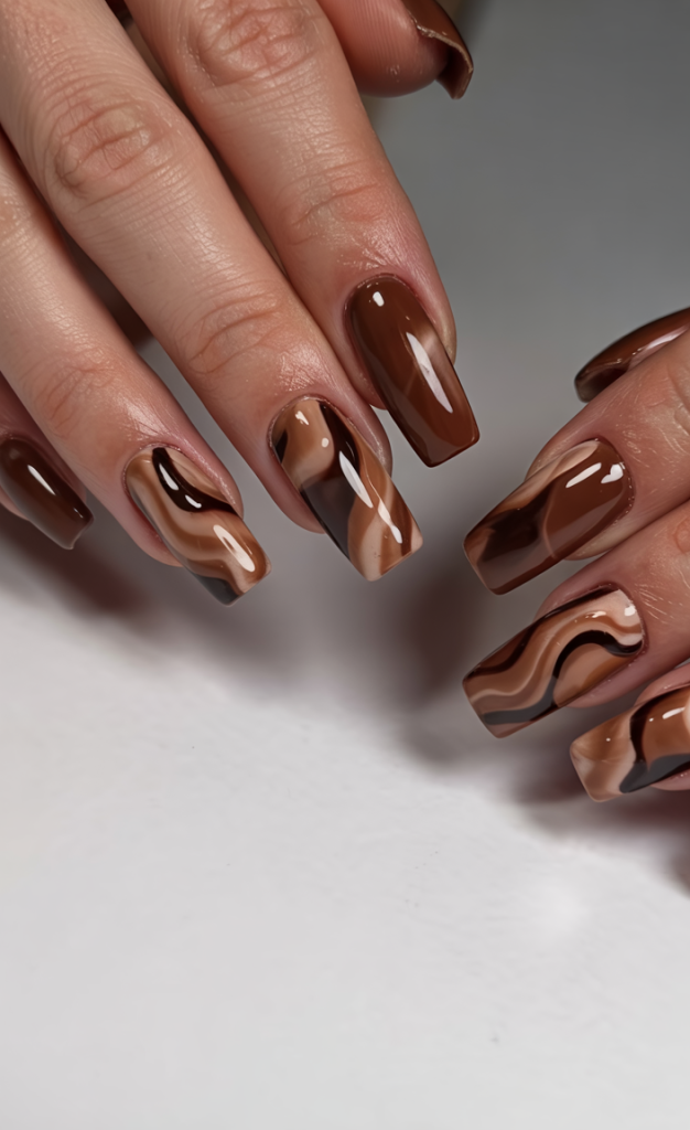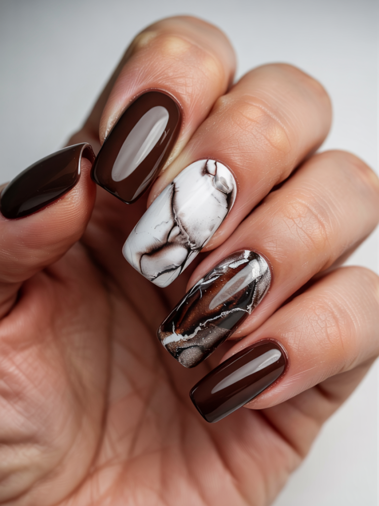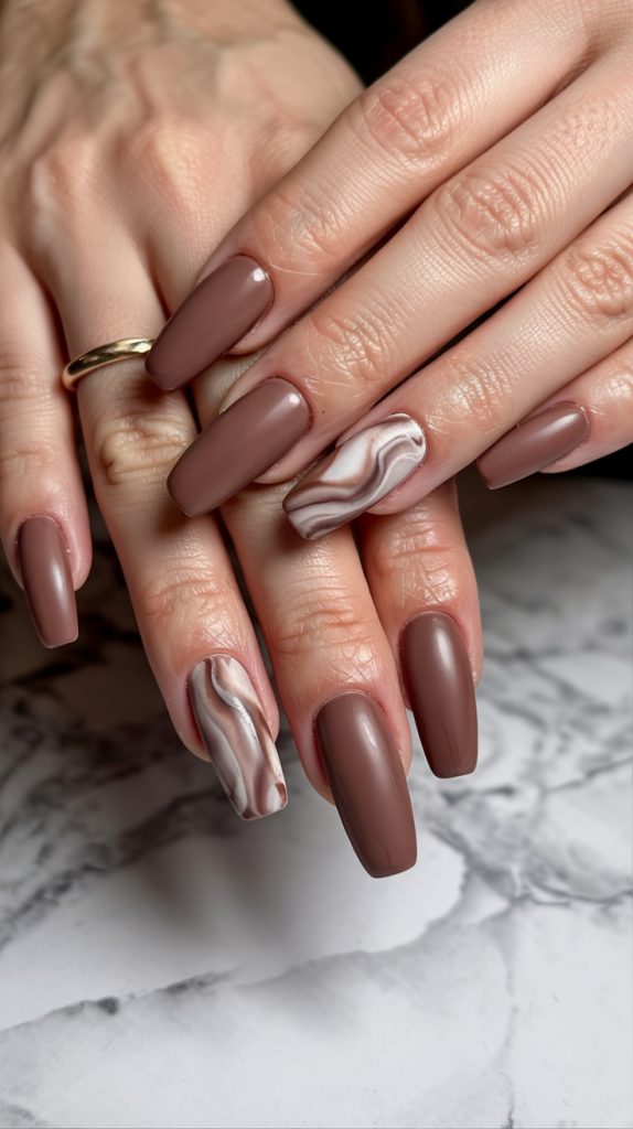 It is a silk matte brown foundation that has the consistency of fresh leaves under your feet full, earthy, and classy. The marble accent nails contribute without dominating and it is thus an ideal combination between contemporary minimalism and quotidian coziness.