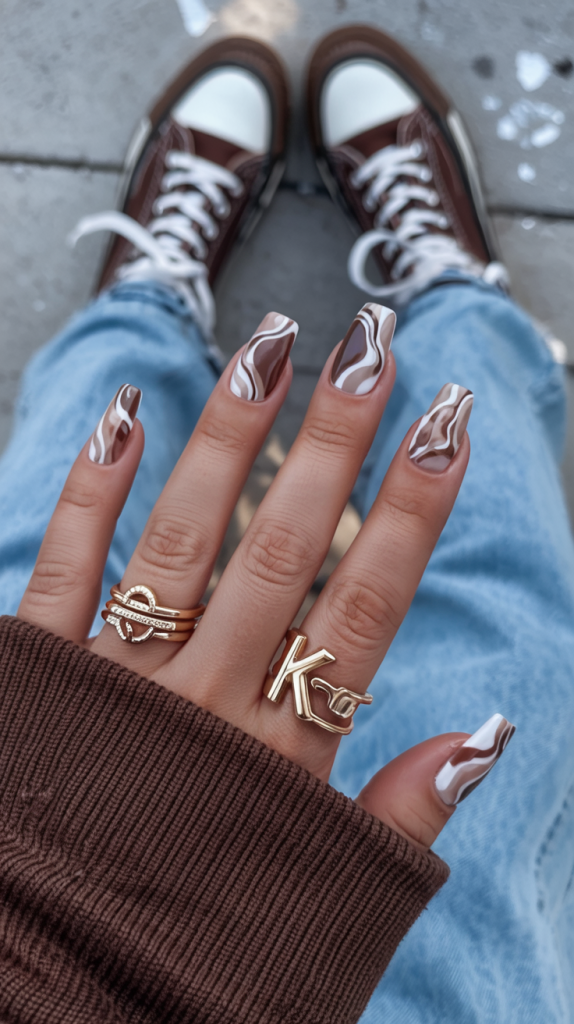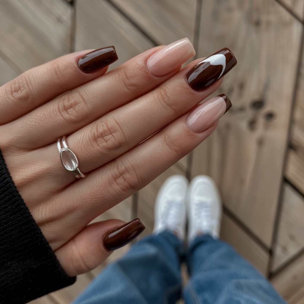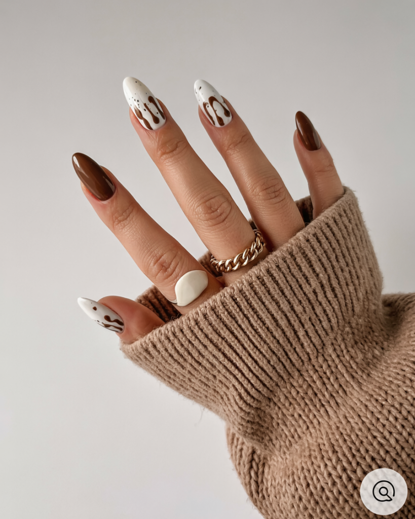 These nails look like icing on your hands because a dripping caramel chocolate baths over bob white foundations like an icing and fudge swirl. It’s cute, playful, and gives strong cozy-sweater energy. Perfect for pumpkin patch days or baking weekends.