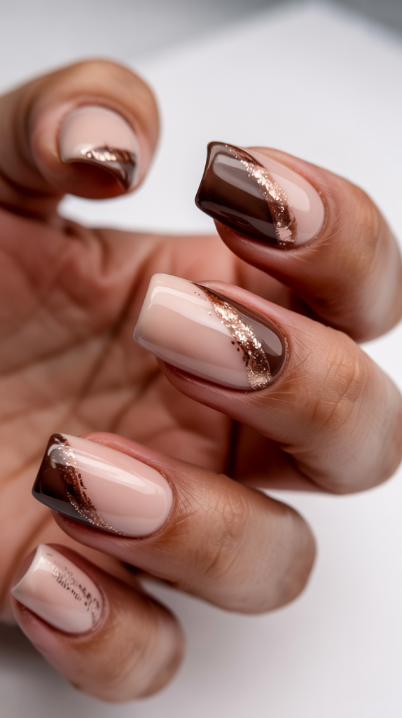 The gentle bend of bronze glitz over warm brown tips is something about luxuriousness instantly. It feels like the oversized sweater of your dreams with a statement pair of earrings, although you are feeling comfy and glamorous at the same time. The fingers also are the benefit of the diagonal sweep, which extends them in a pleasing way.