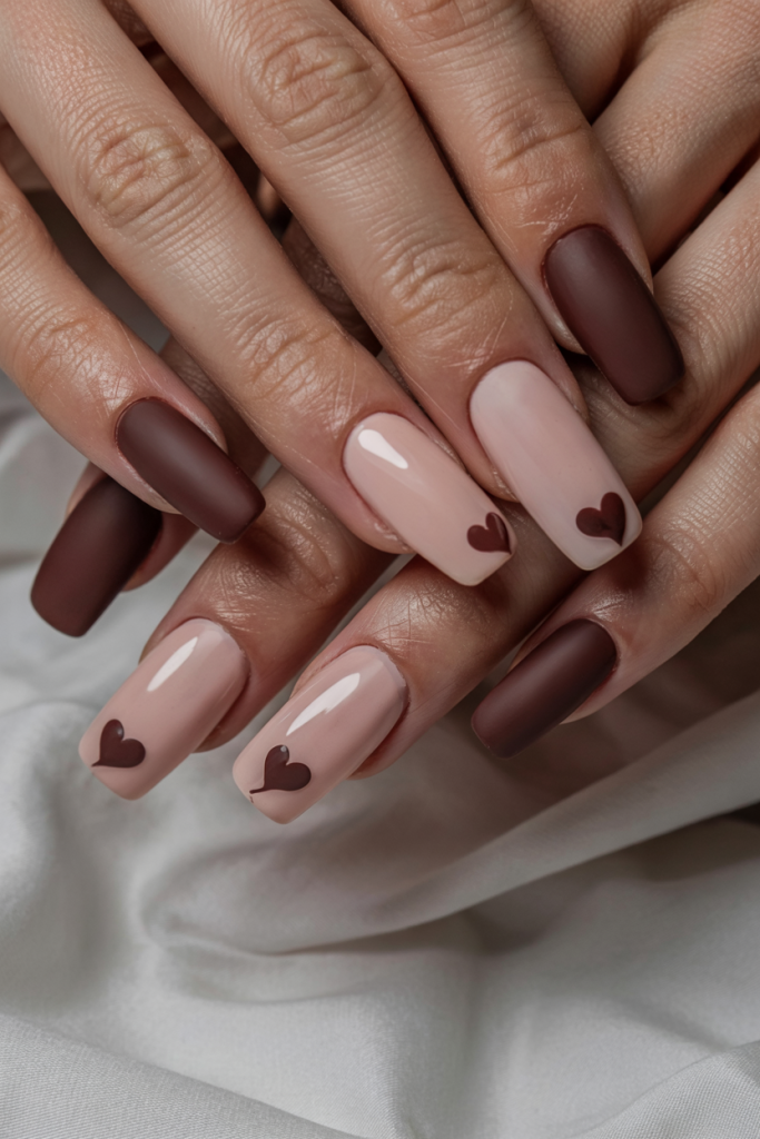 Not childish enough to be called sweet, but still not childish, these cocoa tones with heart accent nails are made with a sweet blush base, though. Romantic and grounded. This is equivalent to leaving notes loving you in your fall planner. The matte nails provide a perfectly guesstimate contrast against the shiny hearts.