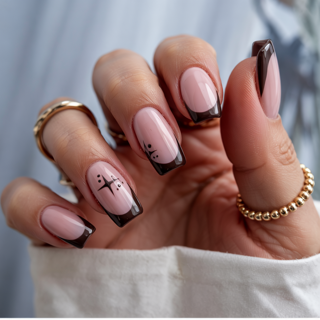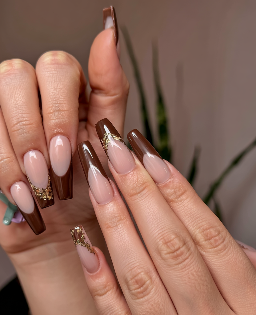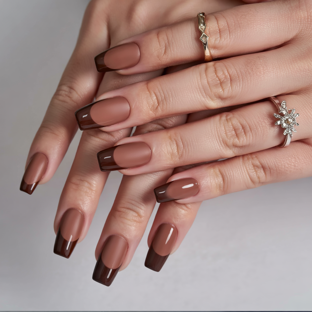 This French tip comes in this two-colour chocolate and it is elegance declassΓ©. The light matte brown starting point and shiny dark ends add a hint of drama, an ideal choice of a person who adores neutrals, a kind of flavor to something plain. It is like taking a hot coffee in a comfortable cafe listening to your favorite playlist.