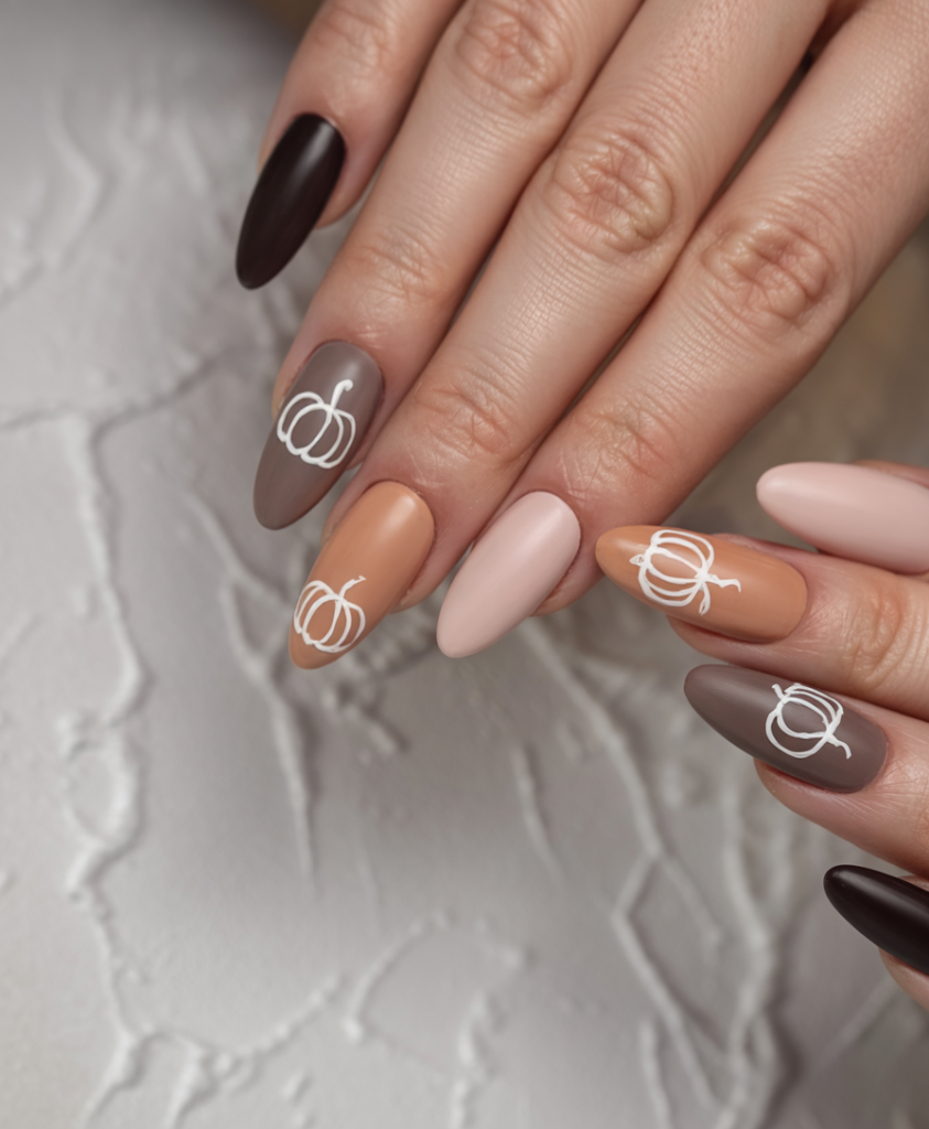 Can anything be more autumnal than pumpkins and materials in matte tones? These cute nails combine warm autumnal colours, taupe, nude, espresso and clay, and wearable pumpkin shapes. Think warm scarves and cinnamon everything.