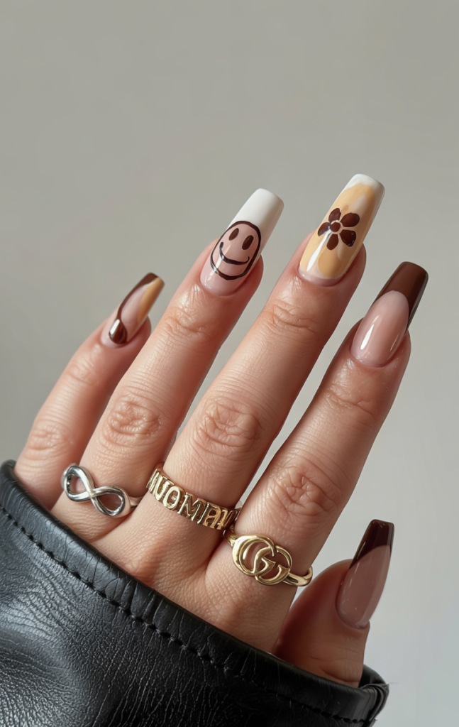 This set is a smiley face with retro floral and creamy brown tip that is a pure happiness on your finger tips. It is not too playful but not too much either, it is as sweet as your favorite autumn playlist and a caramel macchiato at the same time. This is a bit nostalgic and is even more sugary.