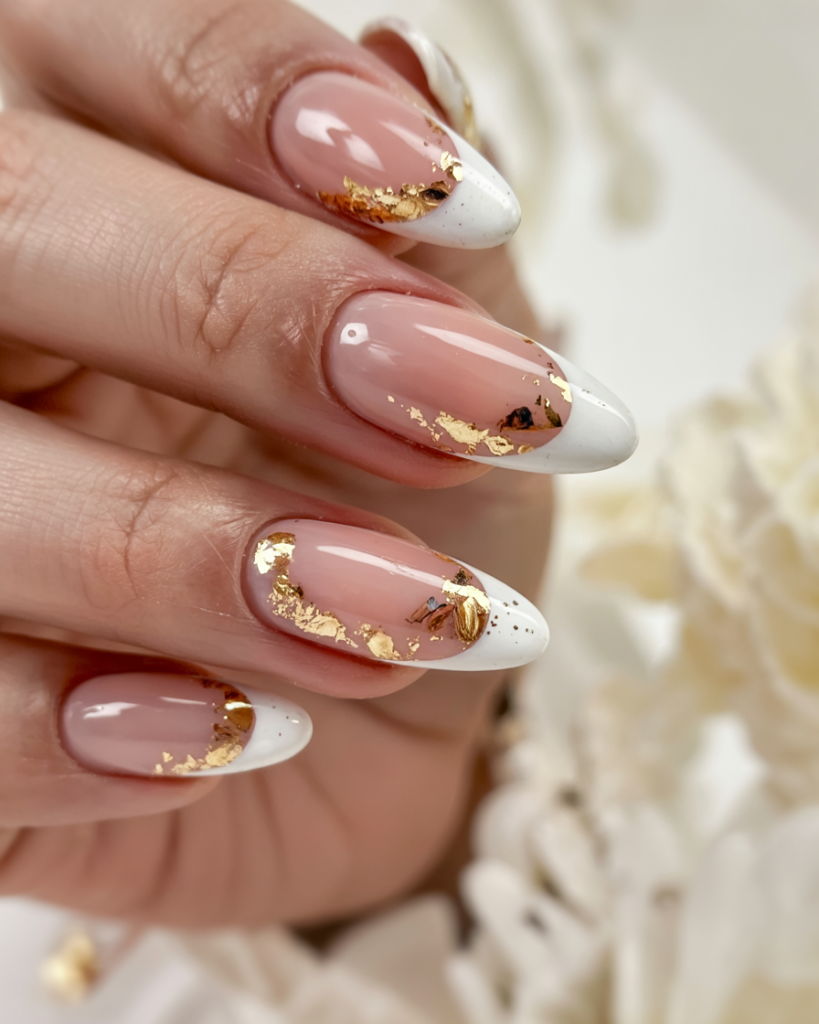 The design seems to be a fresh fall morning that has been hinted with extravagance – pink and white tips that have golden foil dusted over them. It is momish, girlish, and it has that tiny wow factor that makes it reflective and flatters.