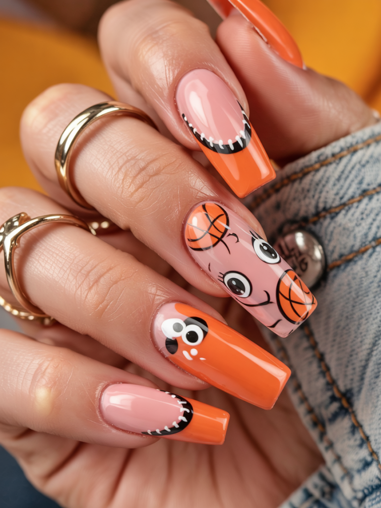 Cute orange outfit This cheeky mix of cartoon pumpkins and French tips with shine uses bold color with high shine. It’s cute, animated, and overflowing with fall spirit. And had autumn anything savouring of a personality, this would be it, warm, foolish, vivacious.